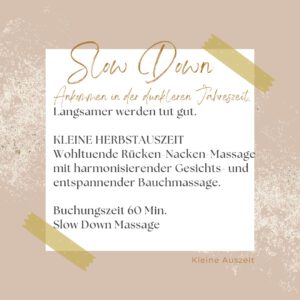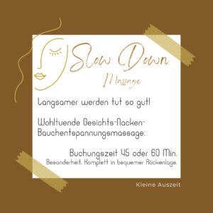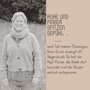 Massage holt aus dem Alltag ab, um ein natürliches Gleichgewicht und Wohlbefinden positiv zu unterstützen. Die Entspannungs- und Wohlfühlmassagen richten sich an Frauen. Ich verzichte bewusst auf zu viel Druck, um eine tiefere Entspannung, Regeneration und ein Wohlfühlen zu unterstützen.